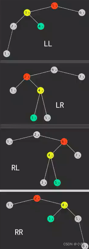 AVL 树的最核心的方法就是插入、更新、删除操作,因为这些操作都有可能造成二叉搜索树失去平衡。为了解决自平衡的特点,需要每一个插入或者更新、删除操作之后,需要检查是否失去平衡,若失去平衡需要通过左旋、右旋、左右旋、右左旋来重新达到平衡状态;若没有失去平衡,无需任何操作。