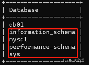 在红色框里面的数据库是 MySQL 自带的数据库,万万不可对这四个数据库进行任何危险操作。否则 MySQL 出现问题,需要重新安装了。