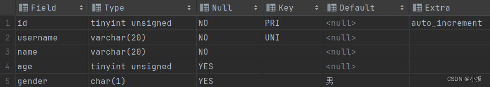 create table tb_user( id tinyint unsigned auto_increment primary key comment '唯一标识', username varchar(20) not null unique comment '用户名', name varchar(20) not null comment '名字', age tinyint unsigned comment '年龄', gender char(1) default '男' comment '性别,默认为男性' )comment '用户表';