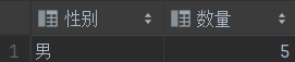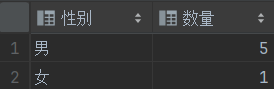 -- 根据性别分组,分别统计男、女人数总量 select gender '性别' , count(gender) '数量' from tb_user group by gender;该操作结果为: