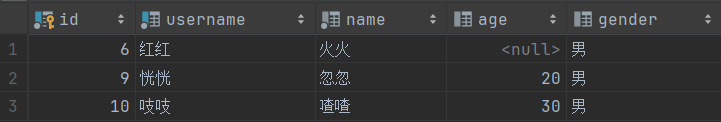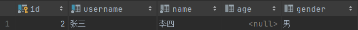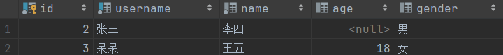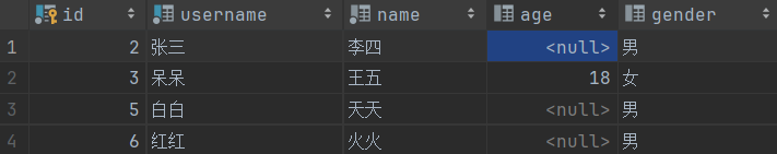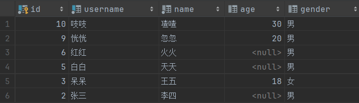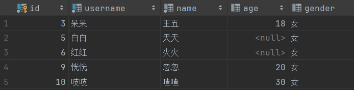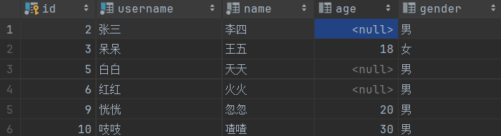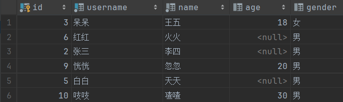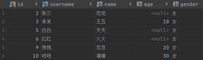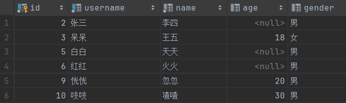 -- 基本查询:查询表中全部数据 select id, username, name, age, gender from tb_user; -- 也可以用 * 来替代 id, username, name, age, gender select * from tb_user;该操作结果为: