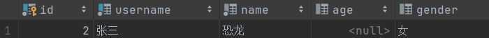 -- 指定字段增添数据 insert into tb_user (id,username,name) values (2,'张三','李四');操作结果为: