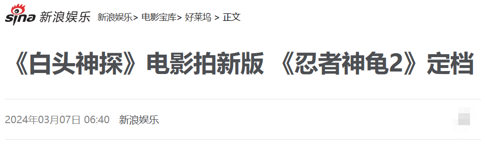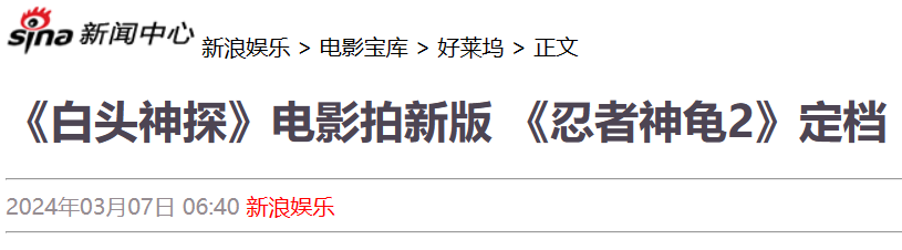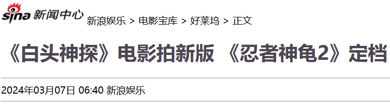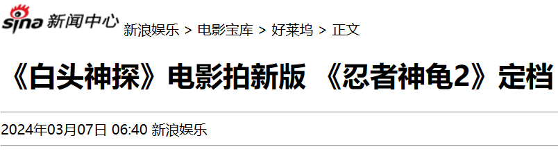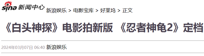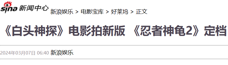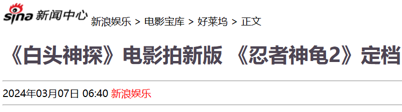 <!DOCTYPE html> <html lang="en"> <head> <meta charset="UTF-8"> <meta name="viewport" content="width=device-width, initial-scale=1.0"> <title>《白头神探》电影拍新版 《忍者神龟2》定档</title> <style> h1 { color: #4d4553; } </style> </head> <body> <img src="https://i2.sinaimg.cn/dy/deco/2012/0613/yocc20120613img01/news_logo.png"> 新浪娱乐 > 电影宝库 > 好莱坞 > 正文 <h1>《白头神探》电影拍新版 《忍者神龟2》定档</h1> <hr> 2024年03月07日 06:40 新浪娱乐 <hr> </body> </html>运行结果为: