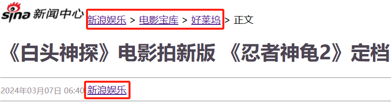 <!DOCTYPE html> <html lang="en"> <head> <meta charset="UTF-8"> <meta name="viewport" content="width=device-width, initial-scale=1.0"> <title>《白头神探》电影拍新版 《忍者神龟2》定档</title> <style> h1 { color: #4d4553; } #id1{ color: #968D92; font-size: 13px; } a { color: black; text-decoration: none; } </style> </head> <body> <img src="https://i2.sinaimg.cn/dy/deco/2012/0613/yocc20120613img01/news_logo.png"> <a href="https://ent.sina.com.cn/" target="_self">新浪娱乐</a> > <a href="https://ent.sina.com.cn/film/">电影宝库</a> > <a href="https://ent.sina.com.cn/hollywood/">好莱坞</a> > 正文 <h1>《白头神探》电影拍新版 《忍者神龟2》定档</h1> <hr> <span id="id1">2024年03月07日 06:40</span> <span> <a href="https://ent.sina.com.cn/hollywood/">新浪娱乐</a></span> <hr> </body> </html>运行结果为: