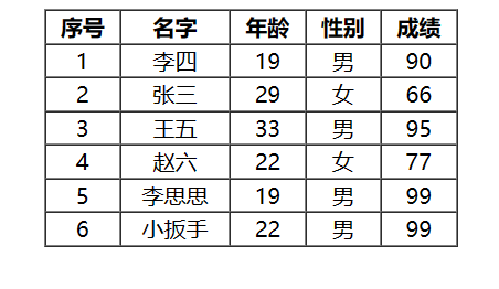 <!DOCTYPE html> <html lang="en"> <head> <meta charset="UTF-8"> <meta name="viewport" content="width=device-width, initial-scale=1.0"> <title>Document</title> <script src="https://cdn.jsdelivr.net/npm/vue/dist/vue.js"></script> </head> <body> <div id="app"> <table cellspacing="0px" border="1px" align="center" width="300px"> <tr> <th>序号</th> <th>名字</th> <th>年龄</th> <th>性别</th> <th>成绩</th> </tr> <tr v-for="(user, index) in users"> <td align="center">{{index+1}}</td> <td align="center">{{user.name}}</td> <td align="center">{{user.age}}</td> <td align="center" v-if="user.gender == 1">男</td> <td align="center" v-else-if="user.gender == 2">女</td> <td align="center">{{user.score}}</td> </tr> </table> </div> </body> <script> new Vue({ el:"#app", data:{ users:[ { name:"李四", age:19, gender:1, score:90 }, { name:"张三", age:29, gender:2, score:66 }, { name:"王五", age:33, gender:1, score:95 }, { name:"赵六", age:22, gender:2, score:77 }, { name:"李思思", age:19, gender:1, score:99 }, { name:"小扳手", age:22, gender:1, score:99 } ] }, methods:{ } }) </script> </html>运行结果: