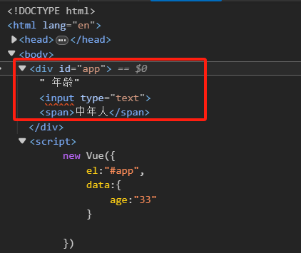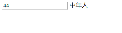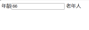 <!DOCTYPE html> <html lang="en"> <head> <meta charset="UTF-8"> <meta name="viewport" content="width=device-width, initial-scale=1.0"> <title>Document</title> <script src="https://cdn.jsdelivr.net/npm/vue/dist/vue.js"></script> </head> <body> <div id="app"> 年龄<input type="text" v-model="age"> <span v-if="age <25">年轻人</span> <span v-else-if="age < 60">中年人</span> <span v-else>老年人</span> </div> </body> <script> new Vue({ el:"#app", data:{ age:"33" } }) </script> </html>运行结果: