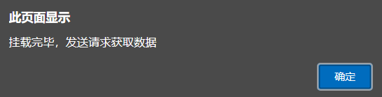 <!DOCTYPE html> <html lang="en"> <head> <meta charset="UTF-8"> <meta name="viewport" content="width=device-width, initial-scale=1.0"> <title>Document</title> <script src="https://cdn.jsdelivr.net/npm/vue/dist/vue.js"></script> </head> <body> </body> <script> new Vue({ el:"#app", data:{ }, mounted() { alert("挂载完毕,发送请求获取数据") }, methods: { }, }) </script> </html>运行结果:
