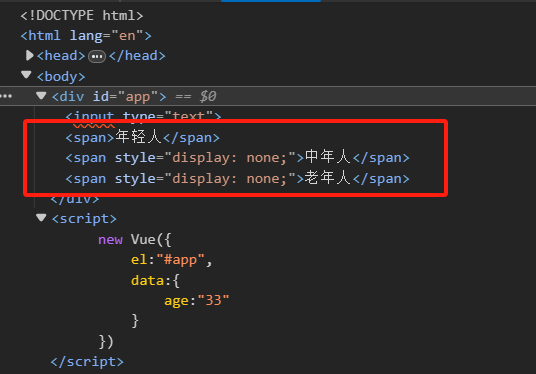 <!DOCTYPE html> <html lang="en"> <head> <meta charset="UTF-8"> <meta name="viewport" content="width=device-width, initial-scale=1.0"> <title>Document</title> <script src="https://cdn.jsdelivr.net/npm/vue/dist/vue.js"></script> </head> <body> <div id="app"> <input type="text" v-model="age"> <span v-show="age <= 33">年轻人</span> <span v-show="age > 33 && age < 60">中年人</span> <span v-show="age > 60">老年人</span> </div> </body> <script> new Vue({ el:"#app", data:{ age:"33" } }) </script> </html>运行结果: