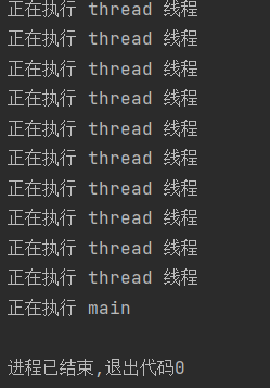public class demo5 { public static void main(String[] args) throws InterruptedException { Thread thread = new Thread(()->{ for (int i = 0; i < 1000; i++) { System.out.println("正在执行 thread 线程"); } }); thread.start(); //等待 0.1 s 就解除阻塞 main 线程,即不会继续等待了 thread.join(1000); System.out.println("正在执行 main"); } }运行结果: