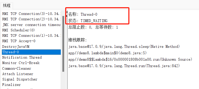 public class demo8 { public static void main(String[] args) { Thread thread = new Thread(()->{ try { Thread.sleep(9000000); } catch (InterruptedException e) { throw new RuntimeException(e); } System.out.println("正在执行 thread 线程"); }); thread.start(); System.out.println("正在执行 main 线程"); } }演示超时等待: