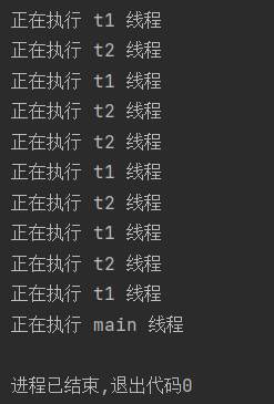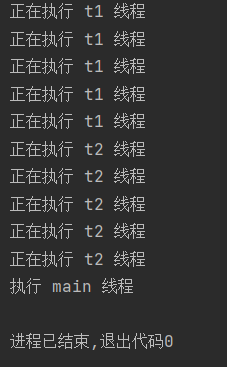 public class demo2 { public static void main(String[] args) throws InterruptedException { Thread t1 = new Thread(()->{ for (int i = 0; i < 5; i++) { try { Thread.sleep(1000); } catch (InterruptedException e) { throw new RuntimeException(e); } System.out.println("正在执行 t1 线程"); } }); Thread t2 = new Thread(()->{ for (int i = 0; i < 5; i++) { try { Thread.sleep(1000); } catch (InterruptedException e) { throw new RuntimeException(e); } System.out.println("正在执行 t2 线程"); } }); t1.start(); t2.start(); t1.join(); t2.join(); System.out.println("正在执行 main 线程"); } }运行结果: