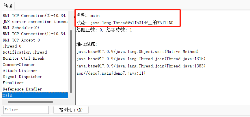 main 线程调用了 thread.join() 方法阻塞等待 thread 线程,又因为 thread 还当前为止还没结束, 所以当前 main 线程被阻塞了,因此 main 状态为 Waiting 状态。对于 thread 线程来说,目前的状态为 Runnable 状态。