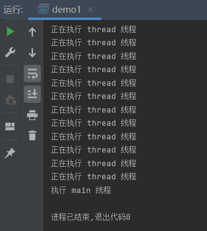 public class demo1 { public static void main(String[] args) throws InterruptedException { Thread thread = new Thread(()->{ for (int i = 0; i < 1000; i++) { System.out.println("正在执行 thread 线程"); } }); thread.start(); thread.join(); System.out.println("执行 main 线程"); } }main 线程调用 thread.join() ,就会阻塞 main 线程继续执行,会让 thread 线程执行完毕之后,main 线程解除阻塞,继续执行下去。