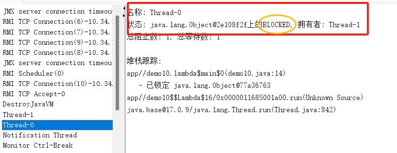 public class demo10 { public static void main(String[] args) { Object o1 = new Object(); Object o2 = new Object(); Thread t1 = new Thread(()->{ synchronized (o1){ try { Thread.sleep(1000); } catch (InterruptedException e) { throw new RuntimeException(e); } synchronized (o2){ System.out.println("正在执行 t1 线程"); } } }); Thread t2 = new Thread(()->{ synchronized (o2){ try { Thread.sleep(1000); } catch (InterruptedException e) { throw new RuntimeException(e); } synchronized (o1){ System.out.println("正在执行 t2 线程"); } } }); t1.start(); t2.start(); } }演示阻塞状态: