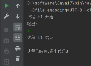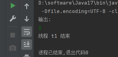 预想过程:只要输出一个非 0 的值时,那么 count 不为 0 了,t1 线程中的循环就会退出,因此会输出 ”线程 t1 结束“ 这句话。最后程序结束。