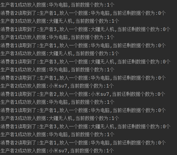 public class ProducerConsumer { public static void main(String[] args) { Desk desk = new Desk(1); //生产者线程1 Thread thread1 = new Thread(()->{ try { while (true) { desk.put("华为电脑"); } } catch (InterruptedException e) { throw new RuntimeException(e); } },"生产者1"); thread1.start(); //生产者线程2 Thread thread2 = new Thread(()->{ try { while (true) { desk.put("小米su7"); } } catch (InterruptedException e) { throw new RuntimeException(e); } },"生产者2"); thread2.start(); //生产者线程3 Thread thread3 = new Thread(()->{ try { while (true) { desk.put("大疆无人机"); } } catch (InterruptedException e) { throw new RuntimeException(e); } },"生产者3"); thread3.start(); //消费者1 Thread thread4 = new Thread(()->{ try { while (true) { desk.take(); } } catch (InterruptedException e) { throw new RuntimeException(e); } },"消费者1"); thread4.start(); //消费者2 Thread thread5 = new Thread(()->{ try { while (true) { desk.take(); } } catch (InterruptedException e) { throw new RuntimeException(e); } },"消费者2"); thread5.start(); } }public class Desk { private final String[] arr; private int size = 0; private int head = 0; private int tail = 0; //有参构造器 public Desk(int size) { this.arr = new String[size]; } //无参构造器,默认大小为10 public Desk(){ this.arr = new String[10]; } //放入数据 public synchronized void put(String data) throws InterruptedException { String name = Thread.currentThread().getName(); String putData = name + ",放入一个数据:" + data; if ( ! (size >= arr.length) ){ arr[tail] = putData; tail++; if (tail >= arr.length){ tail = 0; } size++; System.out.println(name + "成功放入数据:" + data + ",当前数据个数为:" + size + "个"); Thread.sleep(1000); this.notifyAll(); this.wait(); }else { this.notifyAll(); this.wait(); } } //取出数据 public synchronized void take() throws InterruptedException { String name = Thread.currentThread().getName(); if ( !(size == 0)){ String ret = arr[head]; head++; if (head >= arr.length){ head = 0; } size--; System.out.println(name + "读取到了:" + ret + ",当前还剩数据个数为:" + size + "个"); Thread.sleep(1000); this.notifyAll(); this.wait(); }else { this.notifyAll(); this.wait(); } } }一部分的运行结果: