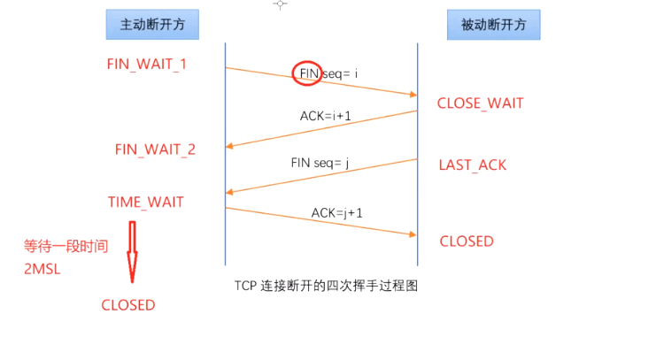 第一次挥手:客户端发送断开连接请求到服务器。客户端已经将全部消息发送完毕了,没有数据发送了。