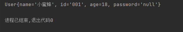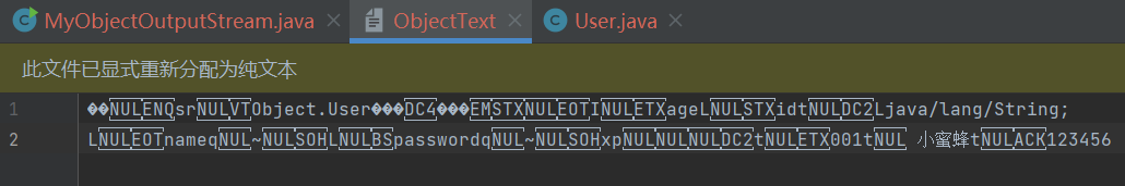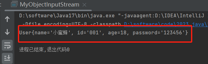 import java.io.FileOutputStream; import java.io.ObjectOutputStream; import java.io.OutputStream; public class MyObjectOutputStream { public static void main(String[] args) { try(//先创建一个低级输出流 OutputStream os = new FileOutputStream("D:\\software\\code\\2023_java\\2023_java_code\\code_24_4_26\\src\\Object\\ObjectText"); //创建序列化流 ObjectOutputStream oos = new ObjectOutputStream(os); ){ //将用户对象写入到文件中 User user = new User("小蜜蜂","001",18,"123456"); oos.writeObject(user); System.out.println("序列化创建成功!!!"); }catch(Exception e){ e.printStackTrace(); } } }import java.io.FileInputStream; import java.io.ObjectInputStream; public class MyObjectInputStream { public static void main(String[] args) { try( //低级输出流//再利用低级流作为参数来创建对象输出流 ObjectInputStream ois = new ObjectInputStream(new FileInputStream("D:\\software\\code\\2023_java\\2023_java_code\\code_24_4_26\\src\\Object\\ObjectText"));){ User user = (User) ois.readObject(); //将对象进行输出 System.out.println(user); }catch (Exception e){ e.printStackTrace(); } } }运行结果: