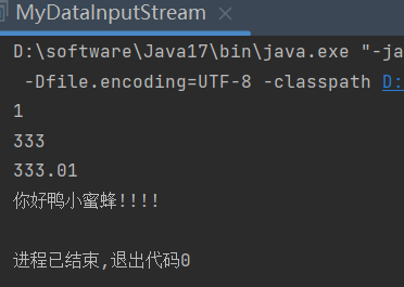 import java.io.DataOutputStream; import java.io.FileOutputStream; import java.io.IOException; import java.io.OutputStream; public class MyDataInOutStream { public static void main(String[] args) { //先创建低级输出流 try(OutputStream os = new FileOutputStream("D:\\software\\code\\2023_java\\2023_java_code\\code_24_4_26\\src\\Data\\DataText"); //再继续转化为高级流 DataOutputStream dos = new DataOutputStream(os); ){ dos.writeByte(1); dos.writeInt(333); dos.writeDouble(333.01); dos.writeUTF("你好鸭小蜜蜂!!!!"); }catch (IOException e){ e.printStackTrace(); } } }运行结果: