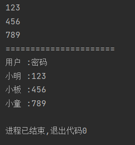 import java.io.FileReader;; import java.util.Properties; import java.util.Set; public class demo2 { public static void main(String[] args) throws Exception { //先创建一个容器 Properties Properties properties = new Properties(); //接着通过load方法将文件中的数据写到容器里 properties.load(new FileReader("D:\\software\\code\\2023_java\\2023_java_code\\code_24_4_29\\src\\MyProperties\\text.properties")); //再把容器中的数据读取出来 //根据一个键来获取一个值的方式 String value = properties.getProperty("小明"); System.out.println(value); String value1 = properties.getProperty("小板"); System.out.println(value1); String value2 = properties.getProperty("小童"); System.out.println(value2); System.out.println("======================"); //获取全部键 Set<String> set = properties.stringPropertyNames(); for (String s : set) { System.out.println(s + " :" + properties.getProperty(s)); } } }运行结果:
