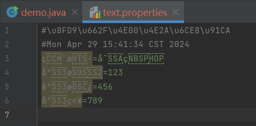 import java.io.FileWriter; import java.io.IOException; import java.util.Properties; public class demo { public static void main(String[] args) throws IOException { //先创建好 Properties 容器 Properties properties = new Properties(); //再通过setProperty方法先将数据写到容器中 properties.setProperty("用户","密码"); properties.setProperty("小明","123"); properties.setProperty("小板","456"); properties.setProperty("小童","789"); //接着通过store方法将容器里的内容写到属性文件中 properties.store(new FileWriter("D:\\software\\code\\2023_java\\2023_java_code\\code_24_4_29\\src\\MyProperties\\text.properties"),"这是一个注释"); } }运行结果: