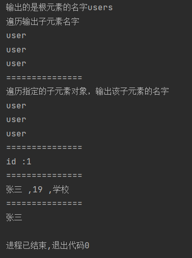 import org.dom4j.Attribute; import org.dom4j.Document; import org.dom4j.DocumentException; import org.dom4j.Element; import org.dom4j.io.SAXReader; import java.util.List; public class demo { public static void main(String[] args) throws DocumentException { //先创建解析器 SAXReader saxReader = new SAXReader(); //通过解析器的read方法,将XML进行解析为Document Document document = saxReader.read("D:\\software\\code\\2023_java\\2023_java_code\\code_24_4_29\\src\\MyXML\\text2.xml"); //根据document对象先获取根元素对象 Element rootElement = document.getRootElement(); System.out.println("输出的是根元素的名字"+rootElement.getName()); //根据根元素再通过无参elements()方法获取全部子元素对象 List<Element> elementList = rootElement.elements(); //进行遍历输出 System.out.println("遍历输出子元素名字"); for (Element element : elementList) { System.out.println(element.getName()); } System.out.println("==============="); //根据根元素通过有参elements(String name)方法获取指定名字的子元素对象 System.out.println("遍历指定的子元素对象,输出该子元素的名字"); List<Element> elementList1 = rootElement.elements("user"); for (Element element : elementList1) { System.out.println(element.getName()); } System.out.println("==============="); //获取指定的元素,如果有同名,将会获取第一个user的Element对象 Element element = rootElement.element("user"); //再获取该对象的全部的属性,并将其输出属性名与属性值 List<Attribute> attributeList = element.attributes(); for (Attribute attribute : attributeList) { System.out.println(attribute.getName() + " :" +attribute.getValue()); } System.out.println("==============="); //通过element元素来获取子元素的文本 String name = element.elementText("name"); String age = element.elementText("age"); String address = element.elementText("地址"); System.out.println(name + " ," + age + " ," + address); System.out.println("==============="); //通过element获取下的子元素 Element elementName = element.element("name"); //再来输出文本 String name1 = elementName.getText(); System.out.println(name1); } }运行结果: