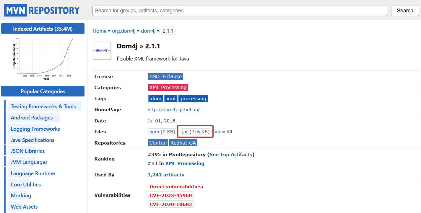1)接下来先下载 Dom4j 。通过该网址 Maven Repository: Search/Browse/Explore (mvnrepository.com) ,进去搜索 Dom4j 。