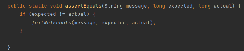 调用静态的断言方法,第一个参数是如果预测的结果与测试出来的结果不一样时,提供的消息。第二个参数是自己预测的结果。第三个参数是测试出来的结果。
