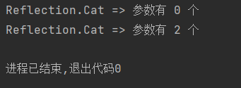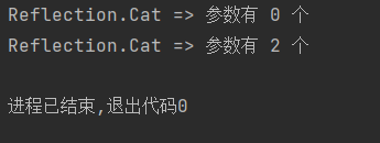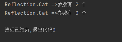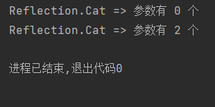 import java.lang.reflect.Constructor; public class demo5 { public static void main(String[] args) throws NoSuchMethodException { //第一步先获取Class对象 Class c = Cat.class; //第二步再获取指定的构造器 //先获取无参的构造器 Constructor c1 = c.getDeclaredConstructor(); System.out.println(c1.getName() + " => 参数有 " + c1.getParameterCount() + " 个"); //获取有参的构造器 Constructor c2 = c.getDeclaredConstructor(String.class,int.class); System.out.println(c2.getName() + " => 参数有 " + c2.getParameterCount() + " 个"); } }运行结果: