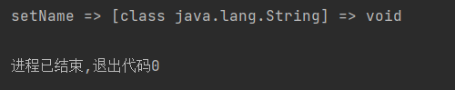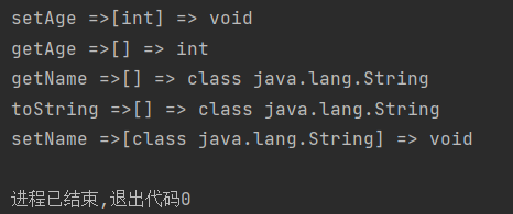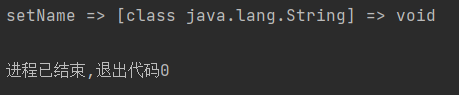 import java.lang.reflect.Method; import java.util.Arrays; public class demo11 { public static void main(String[] args) throws Exception { //先获取class对象 Class c = Cat.class; //再获取指定方法 Method setNameMethod = c.getDeclaredMethod("setName", String.class); System.out.println(setNameMethod.getName() + " => " + Arrays.toString(setNameMethod.getParameterTypes()) + " => " + setNameMethod.getReturnType()); } }运行结果: