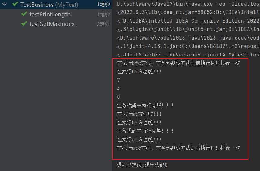 import org.junit.*; //测试业务:对项目业务代码进行测试 public class TestBusiness { //在执行全部测试方法之前,先执行以下代码 @BeforeClass public static void bfc(){ System.out.println("在执行bfc方法,在全部测试方法之前执行且只执行一次"); } //执行每个测试代码之前都会先执行以下的方法 @Before public void bf(){ System.out.println("在执行bf方法啦!!!"); } //执行每个测试代码之后都会执行以下的方法 @After public void at(){ System.out.println("在执行at方法啦!!!"); } //在执行全部测试方法之后,再执行以下代码 @AfterClass public static void atc(){ System.out.println("在执行atc方法,在全部测试方法之后执行且只执行一次"); } //针对每一个方法进行测试,定义测试方法必须是公开、无参、无返回值 //对业务一代码进行测试 //记得要加上注解 @Test public void testPrintLength(){ //然后调用业务一的代码,列举实际例子 ProjectBusiness.printLength("你好世界!!!"); ProjectBusiness.printLength("你好小板"); ProjectBusiness.printLength(null); System.out.println("业务代码一执行完毕!!!"); } //对业务二代码进行测试 @Test public void testGetMaxIndex(){ //接着调用业务二的方法 int index1 = ProjectBusiness.getMaxIndex(null); //进行断言 Assert.assertEquals("此处出现 BUG 啦!!!",0,index1); int index2 = ProjectBusiness.getMaxIndex("你好鸭小板"); //进行断言 Assert.assertEquals("此处出现 BUG 啦!!!",4,index2); System.out.println("业务代码二执行完毕!!!"); } }全部测试方法的结果: