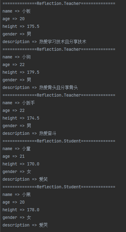 import org.junit.Test; import java.io.FileNotFoundException; public class TestProject { //对该项目业务进行测试: @Test public void testProject() throws FileNotFoundException, IllegalAccessException { Teacher teacher = new Teacher("小板",20,175.5,"男","热爱学习技术且分享技术"); Teacher teacher1 = new Teacher("小狗",22,179.5,"男","热爱骨头且分享骨头"); Teacher teacher2 = new Teacher("小扳手",22,174.5,"男","热爱奋斗"); Student student = new Student("小童",21,170.0,"女","爱笑"); Student student1 = new Student("小黑",20,178.0,"女","爱哭"); Project.business(teacher); Project.business(teacher1); Project.business(teacher2); Project.business(student); Project.business(student1); } }测试结果: