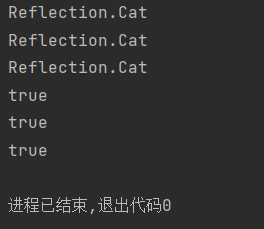 public class demo1 { public static void main(String[] args) throws ClassNotFoundException { //通过类名来获取Class对象 Class c1 = Cat.class; System.out.println(c1.getName()); //通过全类名获取Class对象 Class c2 = Class.forName("Reflection.Cat"); System.out.println(c2.getName()); //通过对象名来获取 Cat cat = new Cat(); Class c3 = cat.getClass(); System.out.println(c3.getName()); System.out.println(c1 == c2); System.out.println(c3 == c2); System.out.println(c1 == c3); } }运行结果: