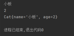 import java.lang.reflect.Method; public class demo12 { public static void main(String[] args) throws Exception { //先获取class对象 Class c = Cat.class; //Cat对象 Cat cat = new Cat(); //再来获取指定的方法来设置名字,年龄 Method setNameMethod = c.getDeclaredMethod("setName", String.class); setNameMethod.setAccessible(true); setNameMethod.invoke(cat,"小板"); Method setAgeMethod = c.getDeclaredMethod("setAge", int.class); setNameMethod.setAccessible(true); setAgeMethod.invoke(cat,2); //查看是否设置成功 Method getNameMethod = c.getDeclaredMethod("getName"); getNameMethod.setAccessible(true); String name = (String) getNameMethod.invoke(cat); System.out.println(name); Method getAgeMethod = c.getDeclaredMethod("getAge"); getAgeMethod.setAccessible(true); int age = (int) getAgeMethod.invoke(cat); System.out.println(age); System.out.println(cat); } }运行结果: