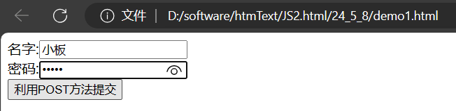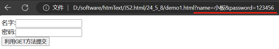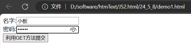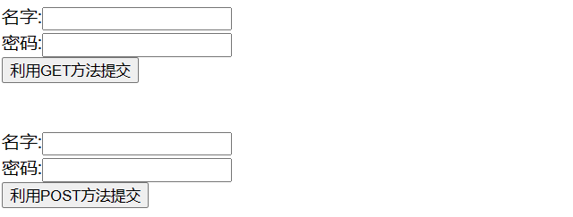 <!DOCTYPE html> <html lang="en"> <head> <meta charset="UTF-8"> <meta name="viewport" content="width=device-width, initial-scale=1.0"> <title>测试</title> </head> <body> <form action="" method="get"> 名字:<input type="text" name="name"> <br> 密码:<input type="password" name="password"> <br> <input type="submit" value="利用GET方法提交"> </form> <br><br> <form action="" method="post"> 名字:<input type="text" name="name"> <br> 密码:<input type="password" name="password"> <br> <input type="submit" value="利用POST方法提交"> </form> </body> </html>运行页面: