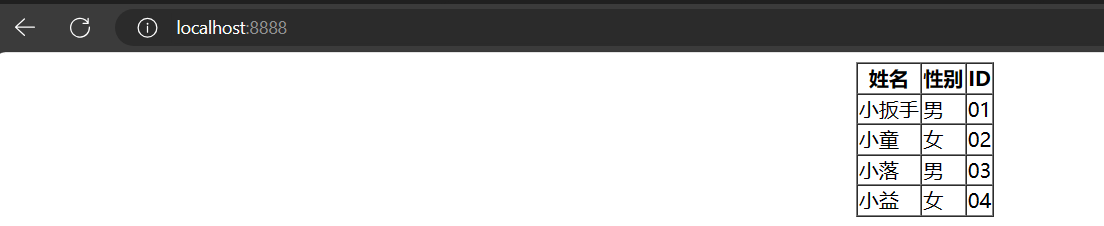 import java.io.IOException; import java.net.ServerSocket; import java.net.Socket; public class Hello { public static void main(String[] args) throws IOException { ServerSocket serverSocket = new ServerSocket(8888); while (true){ //管道接通 Socket socket = serverSocket.accept(); Thread thread = new MyThread(socket); thread.start(); System.out.println(thread.getName() + " 正在执行!!!"); } } }import java.io.*; import java.net.Socket; public class MyThread extends Thread{ Socket socket; public MyThread (Socket socket){ this.socket = socket; } @Override public void run() { try( OutputStream os = socket.getOutputStream(); InputStream is = socket.getInputStream(); BufferedReader reader = new BufferedReader(new InputStreamReader(is)); BufferedWriter writer = new BufferedWriter(new OutputStreamWriter(os)); ){ //先接受客户端请求过来的数据 String s; while (!(s = reader.readLine()).isEmpty()){ System.out.println(s); } StringBuilder stringBuilder = new StringBuilder(); //读取数据 readData(stringBuilder); //接着再返回数据 writer.write("HTTP/1.1 200 OK\r\n"); writer.write("Content-Type:text/html;charset=UTF-8\r\n"); writer.write("\r\n"); writer.write(stringBuilder.toString()); }catch (Exception e){ e.printStackTrace(); } } public void readData(StringBuilder stringBuilder){ try( InputStream inputStream = new FileInputStream("D:\\software\\code\\2023_java\\2023_java_code\\code_24_5_8\\src\\main\\java\\org\\example\\Demo\\response.html"); BufferedReader reader = new BufferedReader(new InputStreamReader(inputStream)); ){ while (true){ String s = reader.readLine(); if ( s == null || s.isEmpty()){ break; } stringBuilder.append(s); } }catch (Exception e){ e.printStackTrace(); } } }<!DOCTYPE html> <html lang="en"> <head> <meta charset="UTF-8"> <meta name="viewport" content="width=device-width, initial-scale=1.0"> <title>测试</title> </head> <body> <table border="1px" cellspacing="0px" align="center"> <tr> <th>姓名</th> <th>性别</th> <th>ID</th> </tr> <tr> <td>小扳手</td> <td>男</td> <td>01</td> </tr> <tr> <td>小童</td> <td>女</td> <td>02</td> </tr> <tr> <td>小落</td> <td>男</td> <td>03</td> </tr> <tr> <td>小益</td> <td>女</td> <td>04</td> </tr> </table> </body> </html>