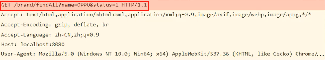 4.1)请求方式-GET:请求参数在请求行中,没有请求体,如:/brand/findAll?name=OPPO&status=1。请求参数而是在请求行中的资源路径后加上 ? 和 请求参数。GET 请求大小是有限制的。