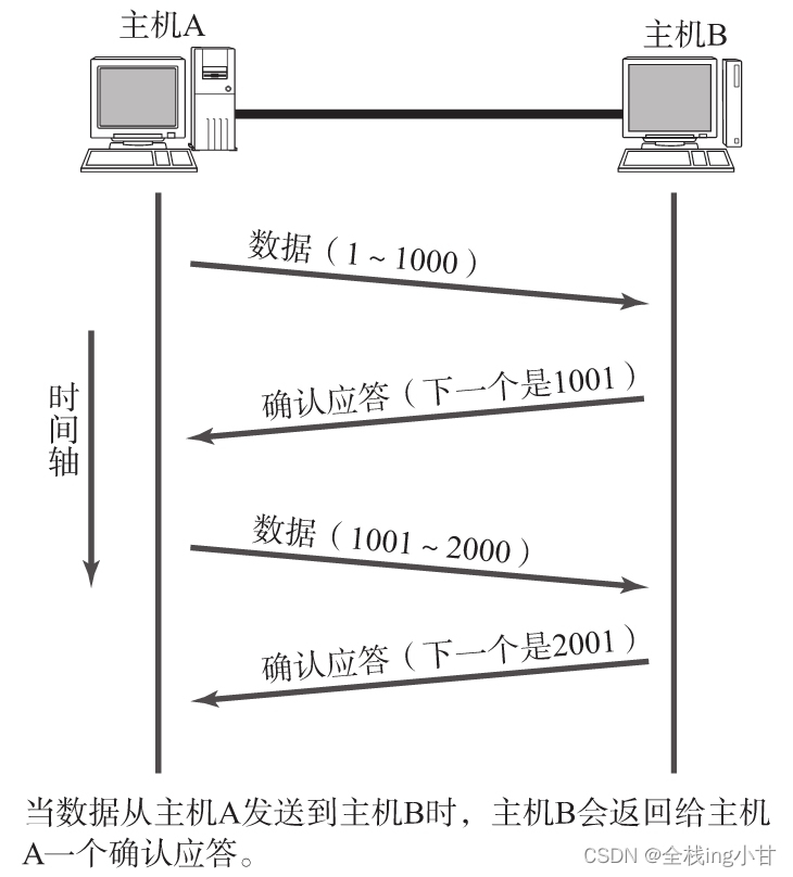 接收方在接收到数据包后会发送确认应答给发送方,确保发送方知道数据包已经成功到达。通过 TCP 报头中的序号和确认序号来实现该机制,当发送方发送的字节,报头中会记录第一个字节的序号,当接收方接收到该数据时,会给发送方响应一个确认序号。表示:接收方已经接收到了数据了,期待下一个数据,下一个数据从第几个字节开始。