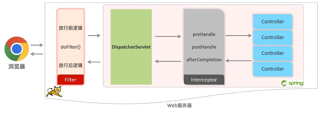 Filter 过滤器与 Interceptor 拦截器配合使用,请求先会被 Filter 过滤器拦截,先执行 Filter 过滤器的前置代码,再执行 doFilter() 方法。如果可以通过,那么该请求就会来到 Interceptor 拦截器,同样先执行前置代码,如果可以放行,那么就可以访问资源。资源访问完之后,又来到 Interceptor 拦截器,执行 postHandle() 方法和 afterCompletion() 方法。再回到 Filter 过滤器中,执行 doFilter() 方法后续的代码。最后响应给客户端。