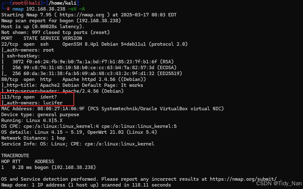 发现额外开放了一个113的端口,服务是ident,并且扫除了用户名为lucifer