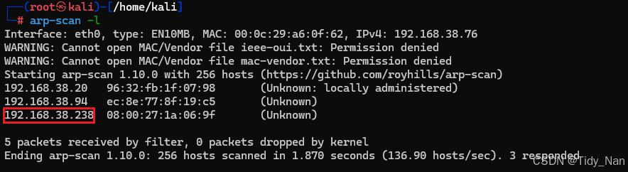 利用arp-scan -l来扫描靶机IP,扫到192.168.38.238为靶机IP