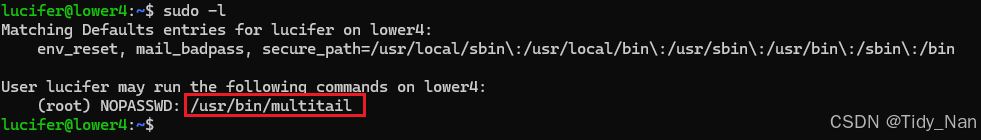 能通过sudo来执行/usr/bin/multitail,用sudo来执行一下这个文件