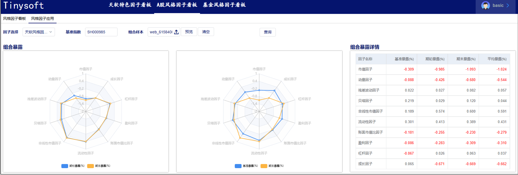 - 近1月SW801200 (申万商业贸易) 与市场基准指数 (SHO00985) 组合因子暴露对比如下: