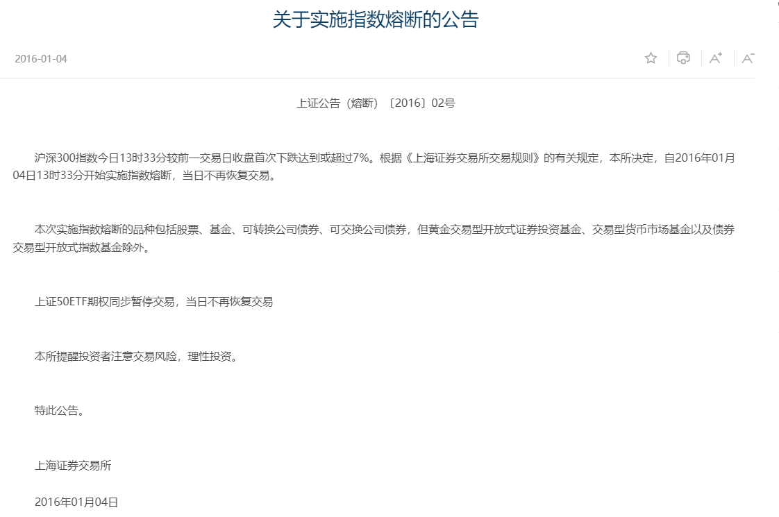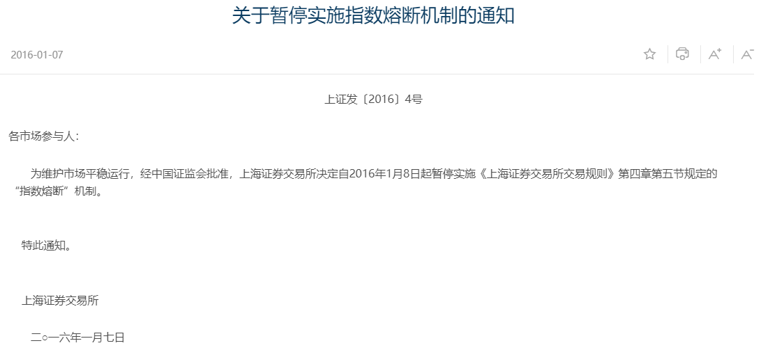 2016年1月8日,经中国证监会批准,上海证券交易所决定暂停实施《上海证券交易所交易规则》第四章第五节规定的“指数熔断”机制,以维护市场平稳运行。”