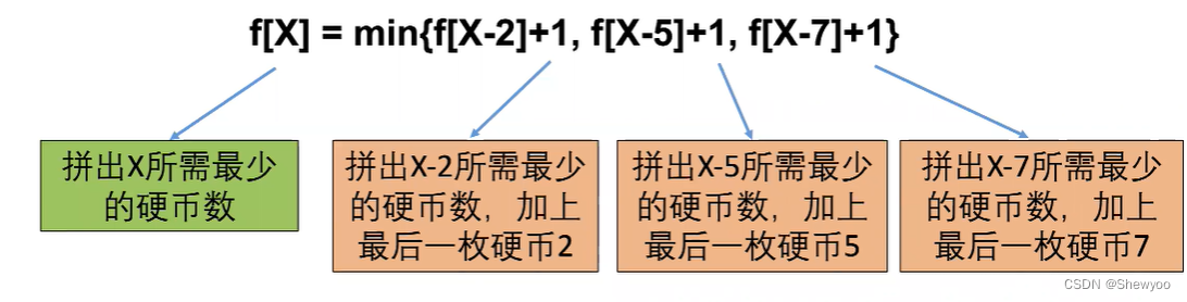 为了简化,可以设状态f(x)=最少用多少枚硬币拼出x。