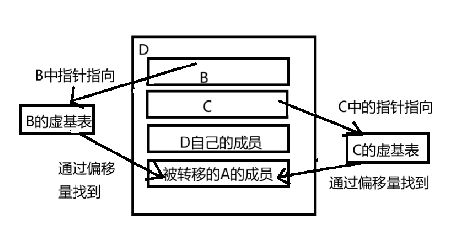 当B,C,D分别继承到A的时候,都会产生一个特定的指针来指向这个虚基表,从而根据虚基表的偏移量来确定A中成员的位置