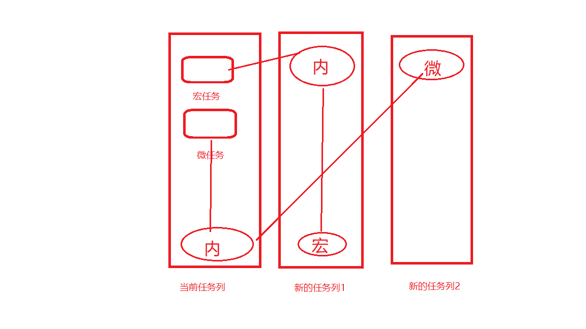当一个宏任务嵌套一个微任和一个微任务里面嵌套一个宏任务并列时,宏任务里面的微任务会比微任务里面的宏任务先执行