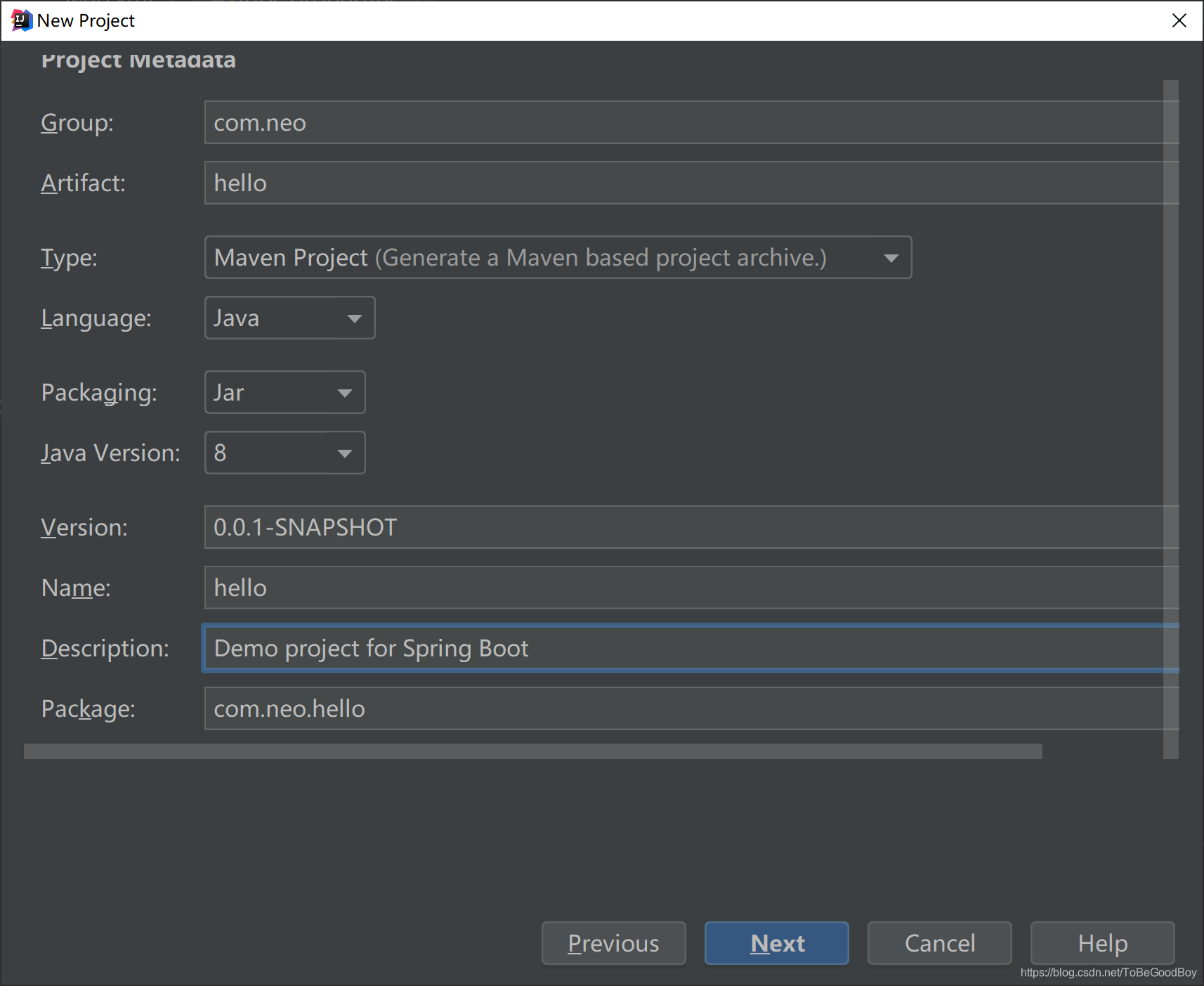 - Artifact,可以理解为项目的名称了,可以根据实际情况来填,本次演示填 hello。