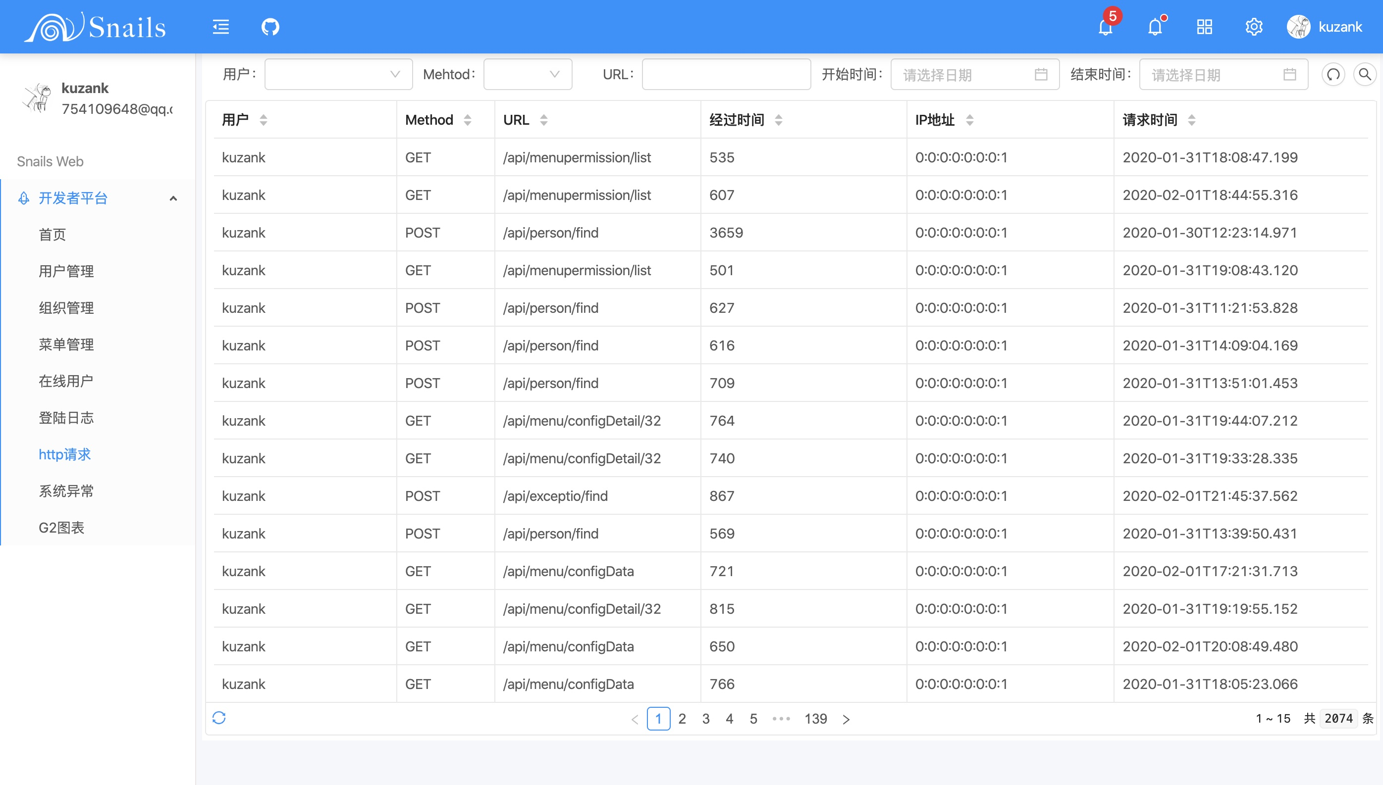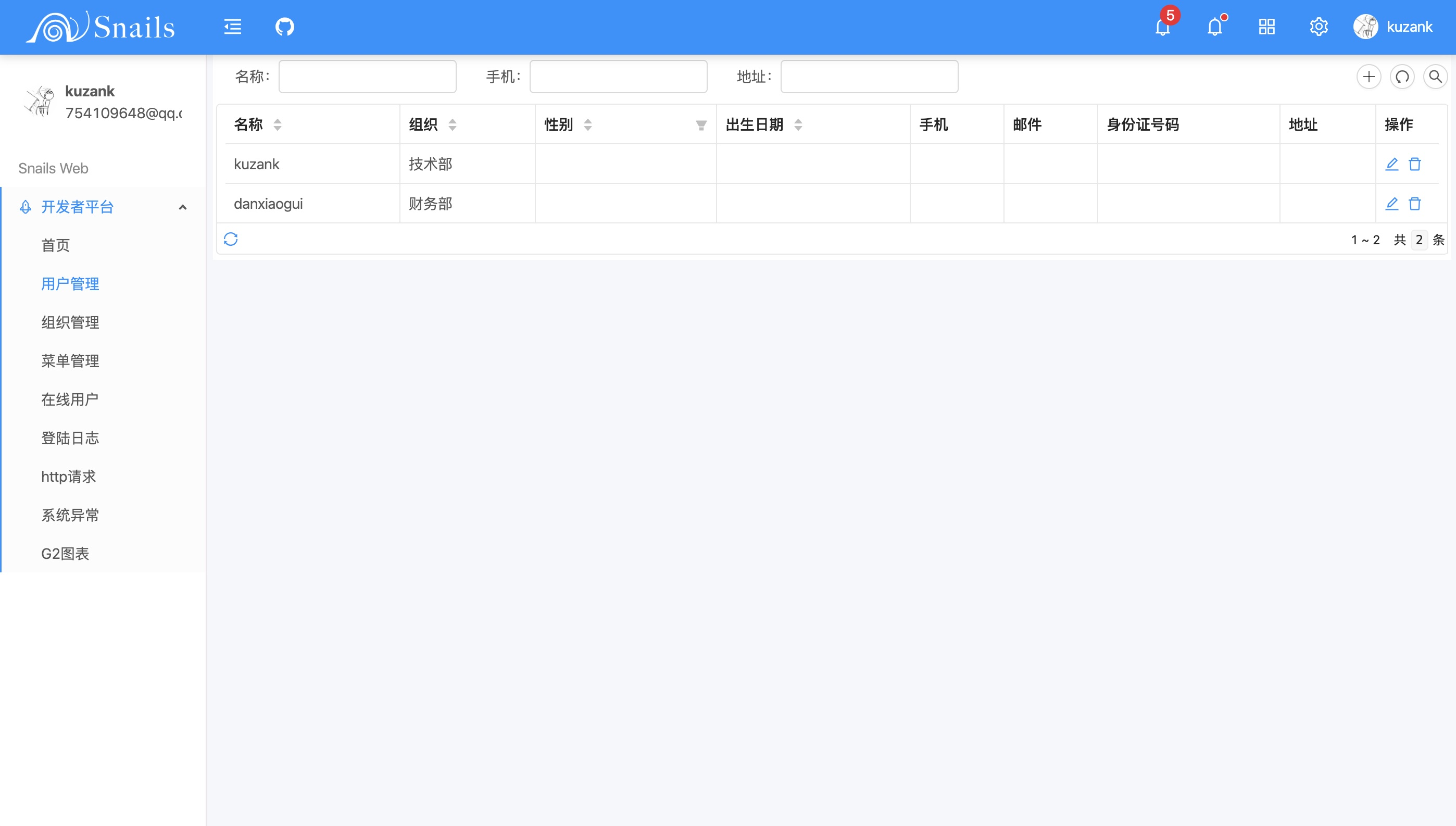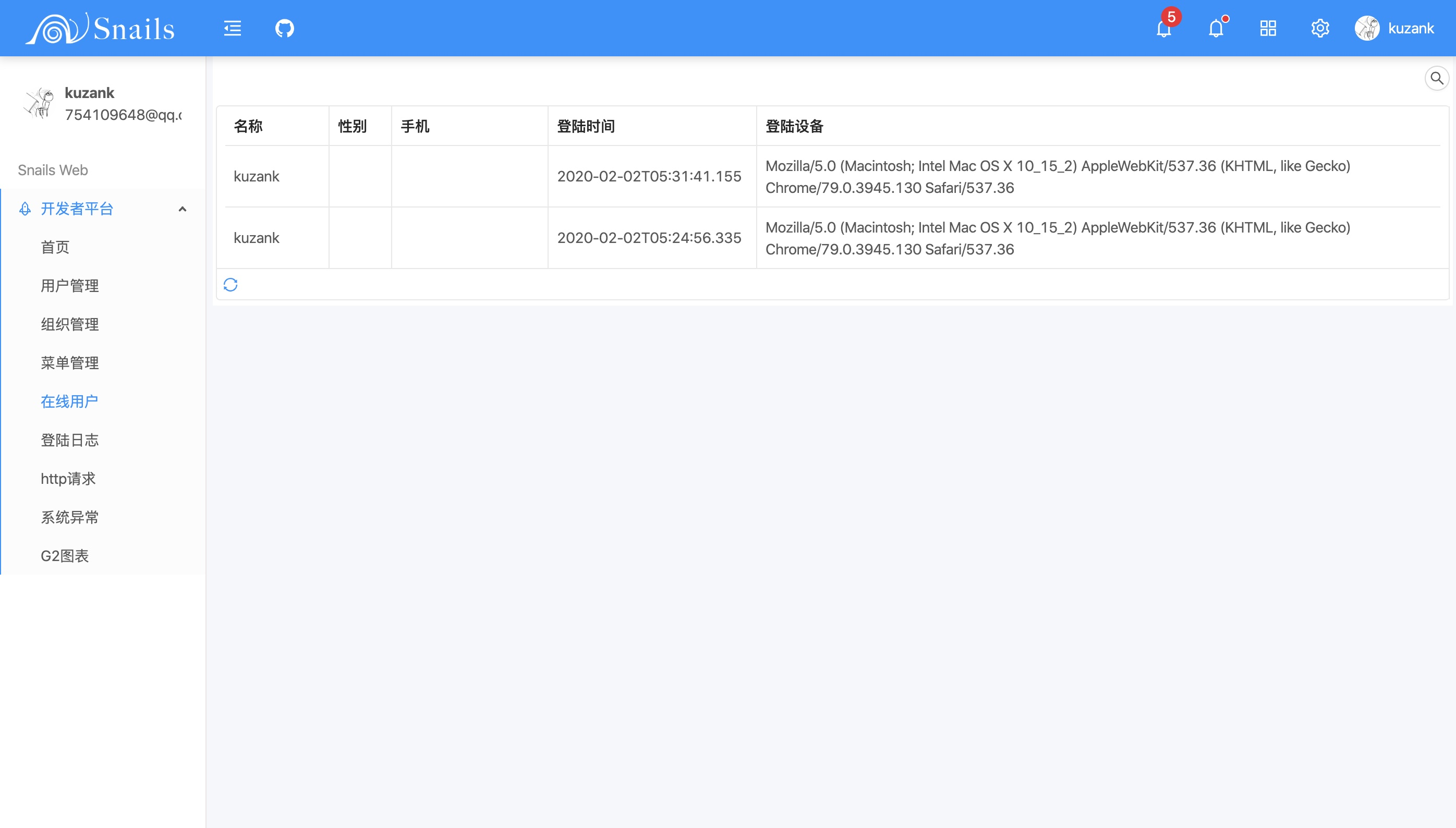| kuzank | kuzank | 123456 | 所属组织:Snails Studio > 技术部 |